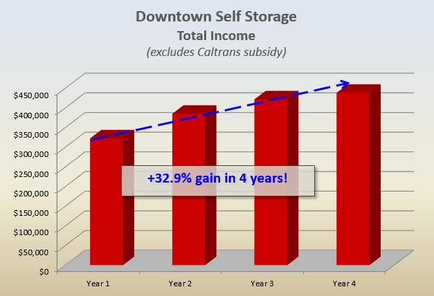 Threatening this lackluster performance even more was Caltrans’ announcement that they planned to expand the freeway overhead and we would have to close the facility while they did. We took an aggressive position with Caltrans regarding our impending revenue loss and were able to negotiate a deal with them whereby they paid us a monthly subsidy check for the difference between actual and 90% occupancy – even though until this point in time the property had only achieved 50% occupancy.